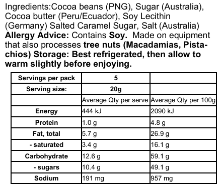 Crafted bean-to-bar in Mission Beach, our dark chocolate is made from cocoa grown on Karkar Island, Papua New Guinea. It delivers deep cocoa intensity with subtle fruity undertones and a clean, lingering finish. The addition of buttery salted caramel creates pockets of crunch and a touch of pink Murray River salt that enhances the natural complexity of the chocolate.