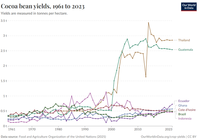 Yields vary from 0.35 tonnes to 3 tonnes. Unfortunately the main producers – Ghana and Cote d’Ivoire are at the 0.5 and below. Honduras and Guatemala planted high yielding cocoa cultivars from 2000, which has significantly increased yields. Australia has access to high yielding cocoa cultivars. Ecuador has some high yielding cultivars that will produce commodity cocoa.