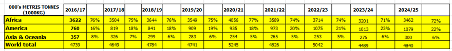 The 2025 season was initially expected to see an increase in cocoa over 2024 from Ghana and Cote d’Ivoire, but both countries downgraded expected production as the year progressed. The most recent ICCO global cocoa forecast (Nov 2025) is 4.698m tonnes from their initial 2025 forecast of 4.840m tonnes.