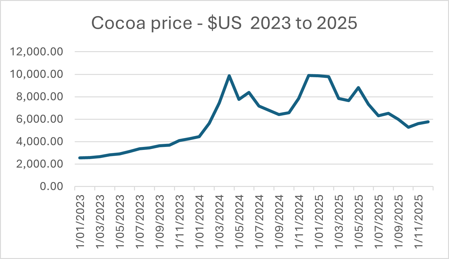 After huge rises in 2024 and early 2025, prices have settled toward the long termed expected price of US$6,000 per tonne for commodity cocoa. Australian high quality cocoa should be able to achieve a premium.